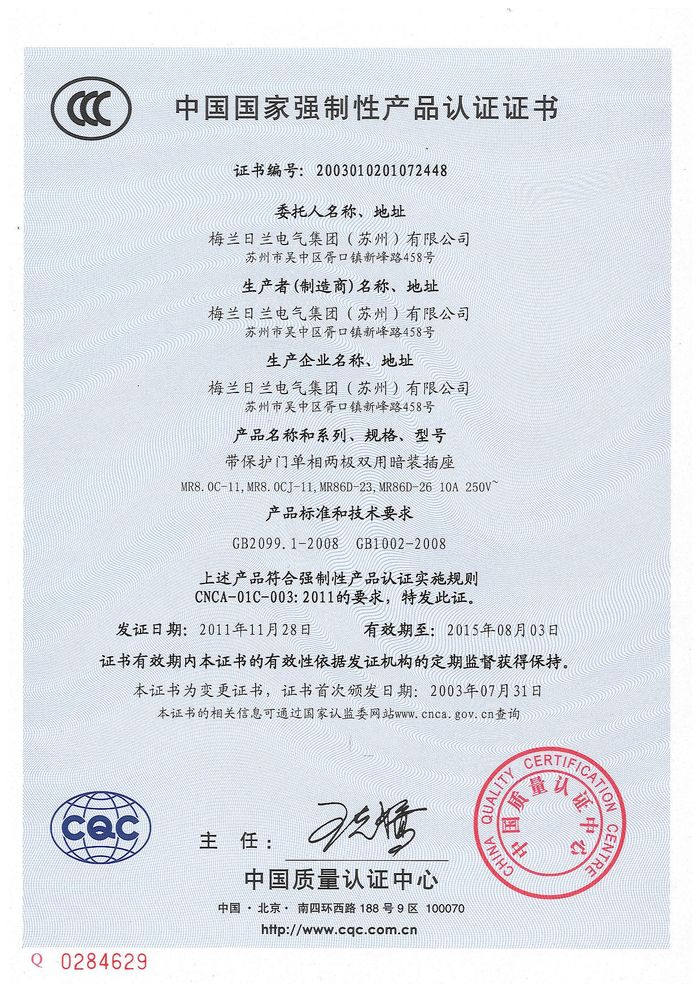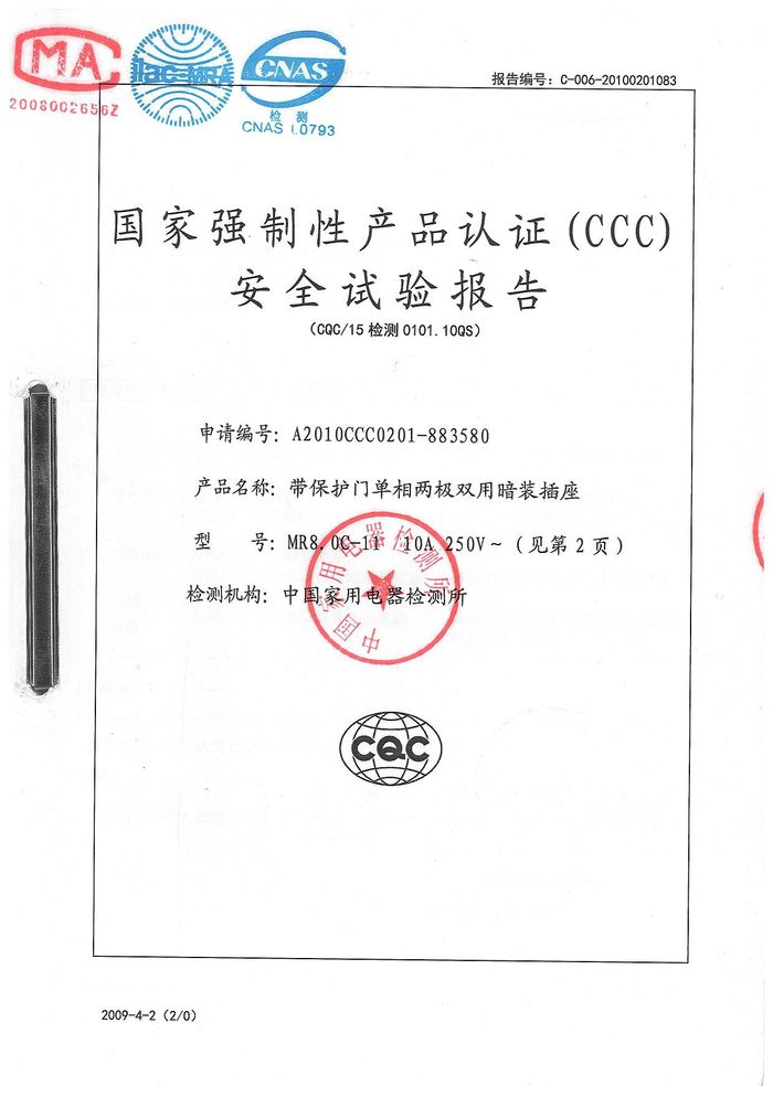 MR8.0C兩位、四位插座資質(zhì)證書