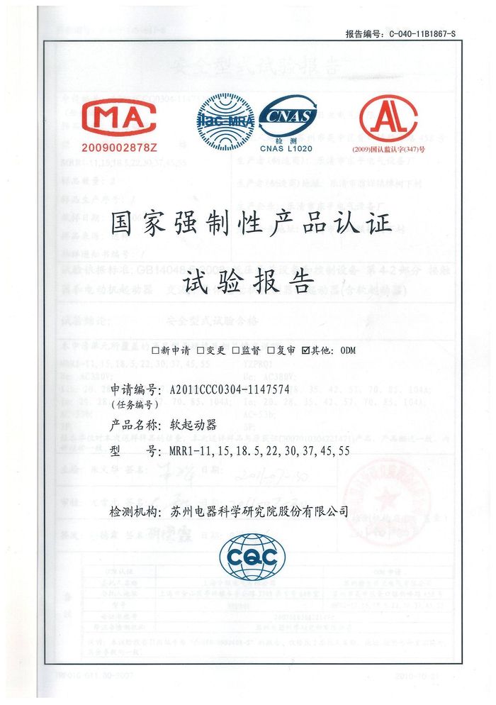 MRR1-11軟啟動資質(zhì)證書