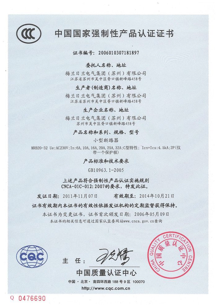 MRB20-32小型斷路器資質(zhì)證書(shū)