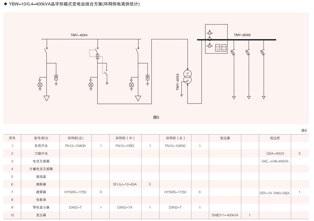 本變電箱高、低壓?jiǎn)卧捎媒M合式柜.按所需要接線組合成高、低壓配電系統(tǒng)常用高、低壓柜的接線方案均可選用,同時(shí)高壓?jiǎn)卧挚山M合成環(huán)網(wǎng)型式等。(見表4、表5)