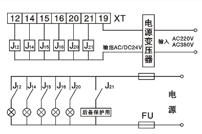 二次接線如圖所示[直流電源DC110V或220V從U1(+)、U2(-)輸入,直流電源模塊兩輸出端分別相應與二次接線