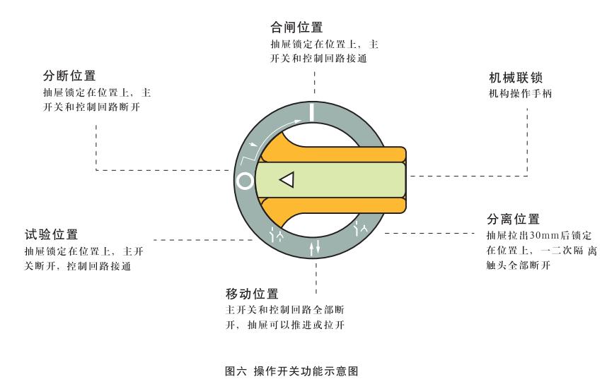 抽屜插入后,將手柄順時針方向轉(zhuǎn)動時,首先到達(dá)“試驗位置”(↓),此時機構(gòu)將外部電源引入控制回路,用戶通過面板上的安全電器(假如有的話)對電路進行試操作,以確認(rèn)其是否符合要求,由于主開關(guān)尚處于斷開狀態(tài),因此一次回路處于無電狀態(tài),即使操作結(jié)果與要求不符也不會損壞設(shè)備,繼續(xù)順時針方向轉(zhuǎn)動到手柄處于水平位置時,即“分?jǐn)辔恢?rdquo;(0)。此時一次和二次回路均處于無電狀態(tài),沿順時針方向繼續(xù)旋轉(zhuǎn)90°則手柄轉(zhuǎn)到“合閘位置”(I),見圖六。