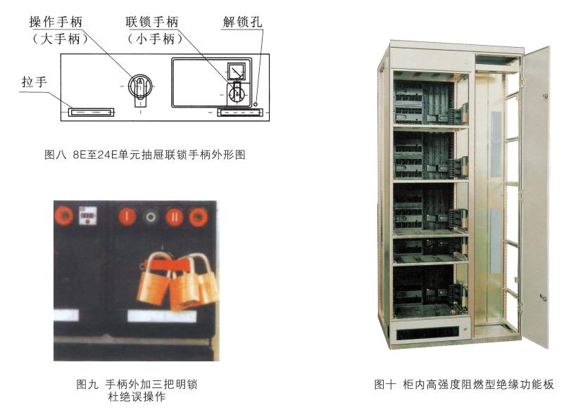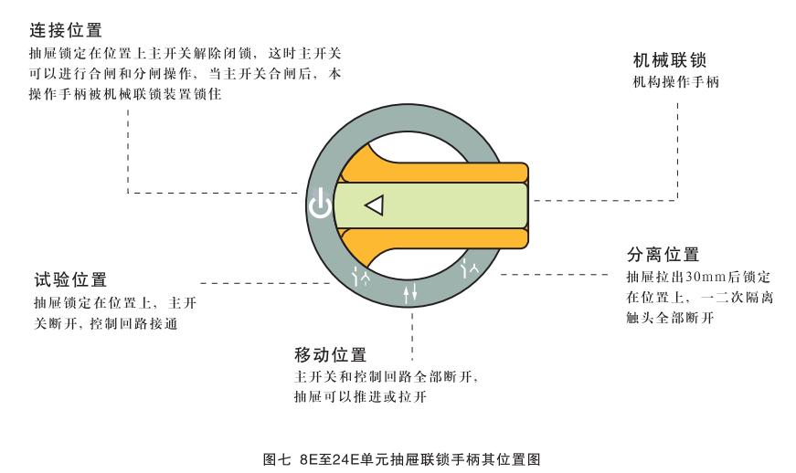 小手柄的操作及其位置定義與8E/4, 8E/2單元操作于柄基本相同,唯一沒有“斷開位置”而代之以“連接位置(↓)。只有當(dāng)手柄處于此位置時,才可操作主開關(guān)操作手柄(大手柄)。大手柄指示箭頭橫向左側(cè)時為“分?jǐn)辔恢?rsquo;,此時一次和二次電路處于無電狀態(tài),大手柄順時針轉(zhuǎn)動到指示箭頭向上時為“合閘位置”,主開關(guān)合閘。小手柄和大手柄的操作有嚴(yán)格的機械聯(lián)鎖,不能隨意操作,更不能硬扳死撬。注意:只有小手柄處在“連接位置”時,大手柄才能進行合閘操作;同時只有大手柄處在“分?jǐn)辔恢?,時,小于柄方能轉(zhuǎn)動。有時大手柄雖也處在“分?jǐn)辔恢?rsquo;但定位不準(zhǔn),這會造成小手柄不能轉(zhuǎn)動或轉(zhuǎn)動不到位,此時千萬不可硬扳,應(yīng)再稍轉(zhuǎn)動大手柄使之準(zhǔn)確到位即可。