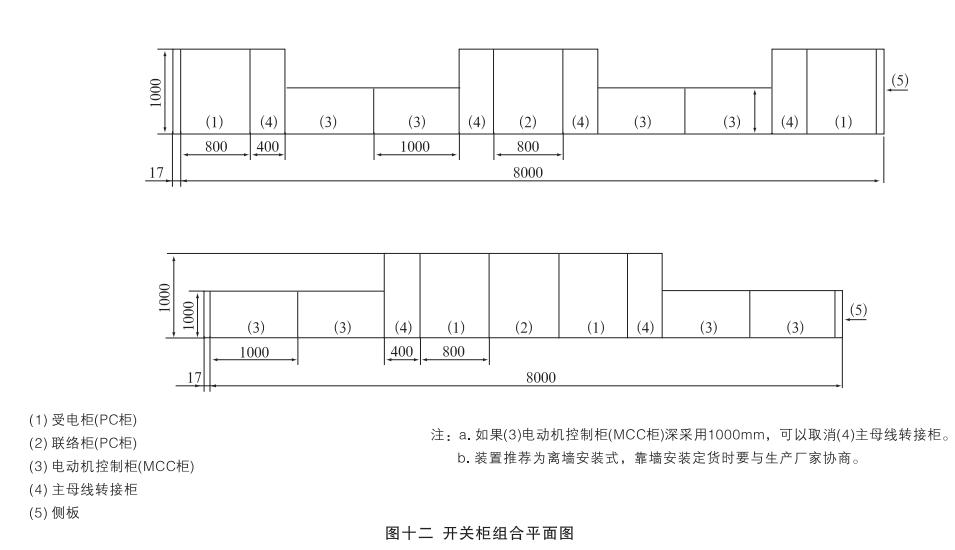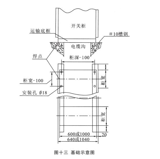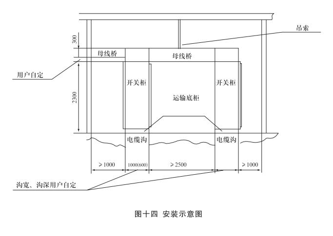 安裝:開關(guān)柜就位。找準(zhǔn)位置,按圖十一所示進行焊接,焊接節(jié)柜和焊長由用戶確定,產(chǎn)品安裝與配電室的相對位置參考圖十二,其中吊索是否安裝由用戶確定,制造商提供的原則是:當(dāng)母線橋的長度大于3米時應(yīng)考慮安裝吊索。但是,當(dāng)母線橋的電流大于或等于2500A時,其長度為2.5米時也應(yīng)安裝吊索。